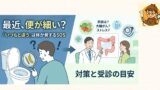 ポリープが大きくなったり、がんが進行したりすると、便の通り道が狭くなり、下痢や便秘、便が細くなるといった症状が現れます。