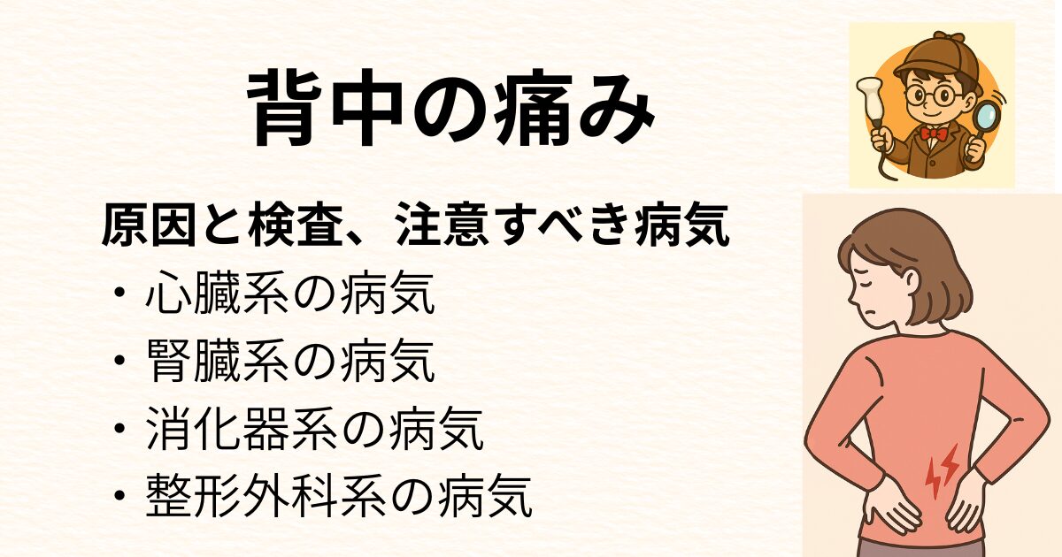 「疲れや姿勢のせいかな」と思って放置してしまいがちですが、実は重大な病気のサインであることもあります。本記事では、背中の痛みを引き起こす代表的な原因と病気、検査方法についてわかりやすく解説します。