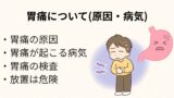 - 主にみぞおちの痛みですが、悪化すると背中に痛みが広がることもあります。